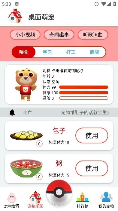 2. 独特的养成玩法:拥有完善的养成系统,喂养宠物有丰富食物可选,还有有趣的学习打工系统,宠物能学习各种技能去打工赚取金币,带来全新养成体验。