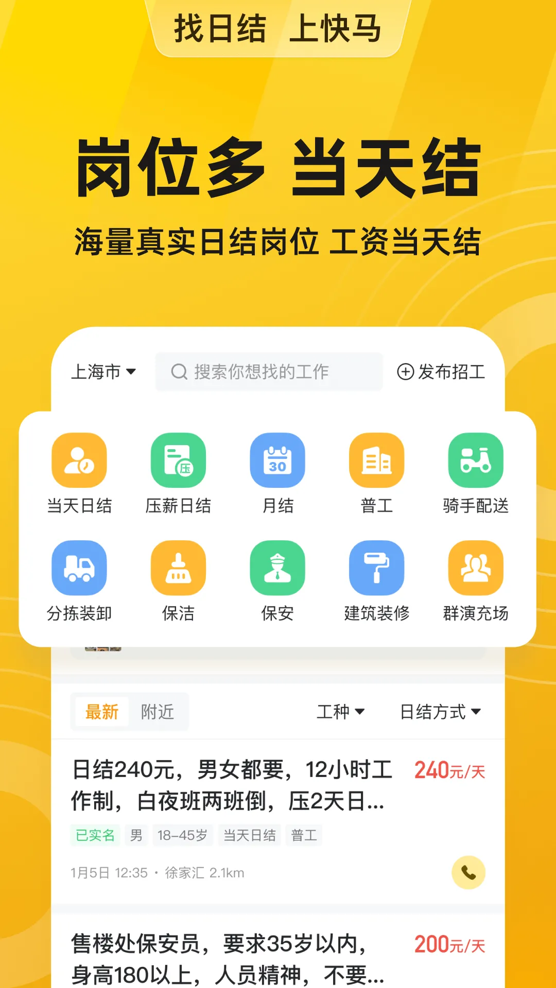 快马日结是一款专注蓝领行业日结兼职招聘找工作的软件,功能超丰富。它能帮用户轻松找活,里面有多种行业,海量岗位真实有效还能日结工资。招聘者可在线免费发布招工信息,轻松管理招工,能实时匹配到合适工人。