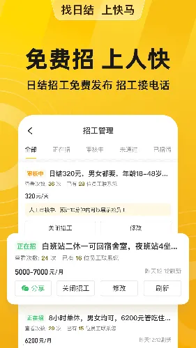 快马日结是一款专注蓝领行业日结兼职招聘找工作的软件。功能丰富,支持招聘者免费发布招工信息并管理,工种分类多,岗位真实有效可日结。为用工企业和蓝领群体提供服务,经严格审核,靠谱有保障。