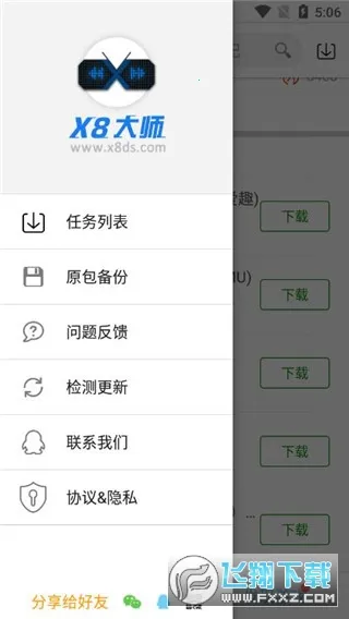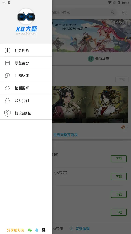 X8大师加速器是一款超棒的手游加速软件。它功能超多,能帮你快速加速游戏,无需获取root权限,告别风险提示,安心玩游戏。操作简单,在平台选游戏下载,按提示卸载原版、安装带X8加速补丁版本就能开启加速。