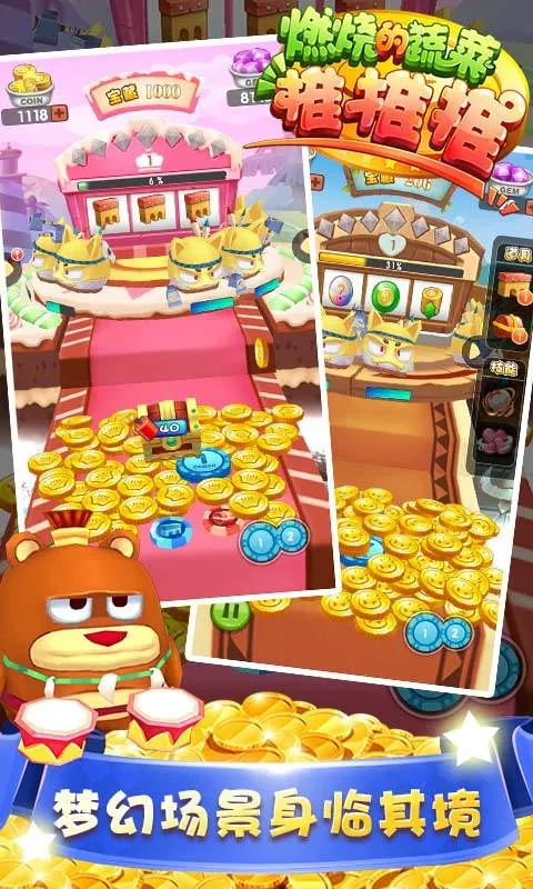 4. 萌系画风呈现:作为燃烧的蔬菜系列最新作品,以3D视角和萌系画风打造独特的推币休闲手游,可爱的怪物和无尽宝藏等待发掘,给玩家带来不一样的视觉体验。