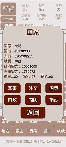 中期努力升官发财,满足称帝条件。每月处理政事积累官职点,还能看广告开师爷自动处理。每年1月升爵位,玉玺在成就里兑换。后期称帝发展国家,收税增加钱粮,发展国力扩建军队。这游戏玩法丰富,能让你感受不一样的明朝生活,体验从默默无闻到巅峰的历程,快来试试吧!