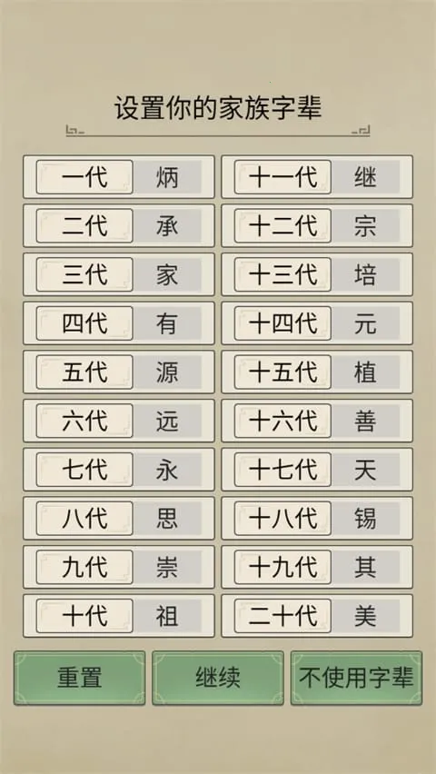 4、设置自己的家族字辈,点击继续;