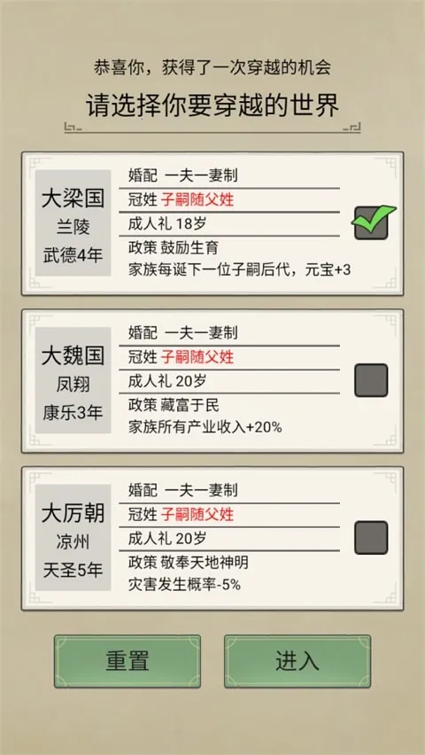 3、确认一下自己的天资、姓名、体魄、文才、武艺等属性,如果对自己的属性不满意的话,可以点击重置;