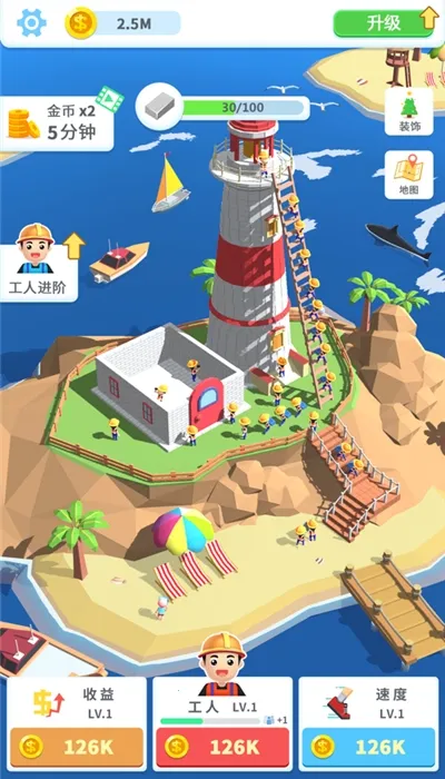 游戏支持放置挂机,离线也能收益。随着等级提升,能解锁更多装饰,增加建筑特色还有加成。另外,能招募不同级别工人,合理安排提高效率,完成任务得大量金币购买道具。快来开启你的疯狂搬砖之旅,打造专属城镇吧!