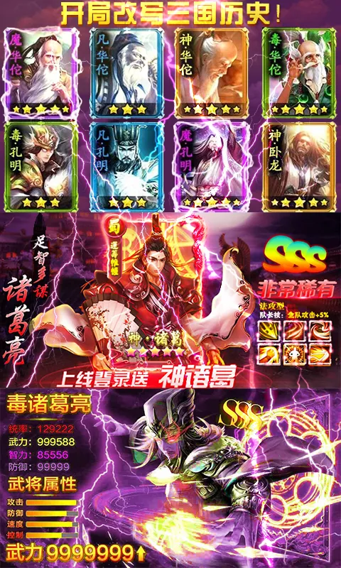 1. 橙将开局:首抽可无限重置,无惧锁卡,百位名将随心搭配,打造无双阵容。