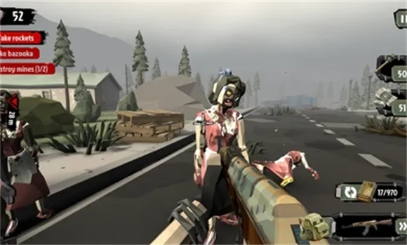 它的玩法简单易上手,左边控制方向,右边负责瞄准、攻击和换弹。进入游戏后,先清除僵尸,完成任务还能解锁新任务,比如保护婴儿,把孩子抱上车再杀僵尸就能完成新手任务。